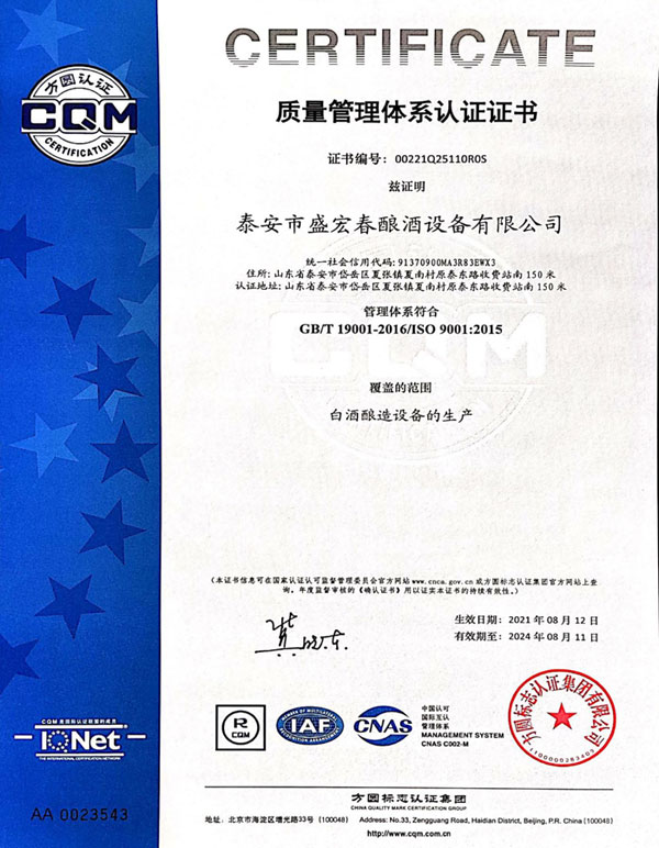 公司是国内最早生产白酒配套设备厂家之一,产品荣获《国际发明技术科学博览会金奖》《山东省星火计划金质奖》《全国星火计划银质奖》《科技进步一等奖》等奖项,公司专业从事白酒 设备十余年,先后获得“山东省科技型中小企业”“山东省明星企业”“泰安市专精特新企业”等称号并连续多年获得纳税企业先进单位和安全生产先进单位;公司通过9001:2015质量管理体系认证;ISO 14001:2015环境管理体系认证;ISO45001:2018 职业安全管理体系认证,是山东省信用协会会员,荣获企业信用等级3A等级证书